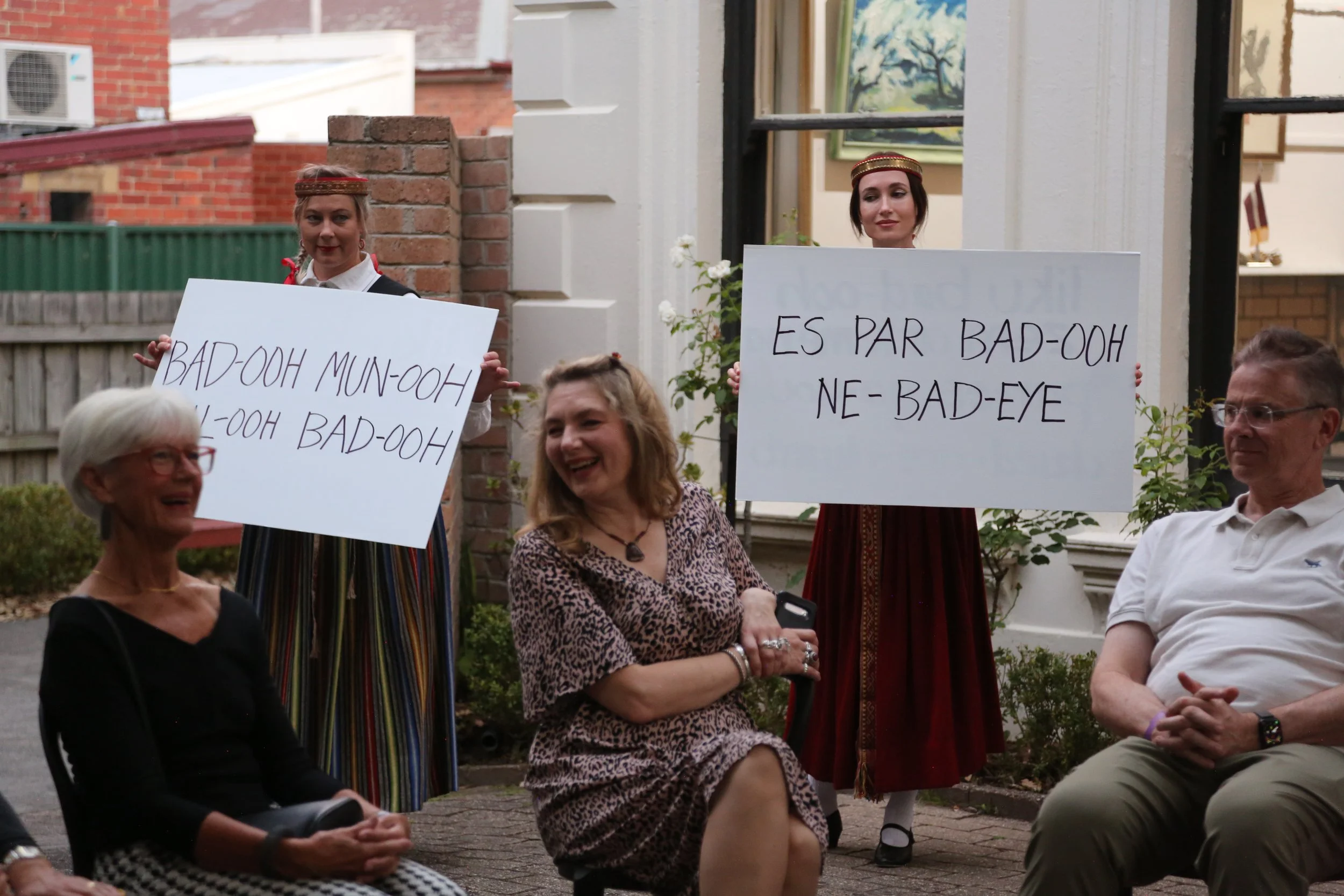 2021. gada nogalē dzīvesstāstu pētniece Ilga Vālodze Ābele kopā ar projekta idejas autori Austrālijas latvieti Brigitu Strodu uzsāka intervijas ar vecākā gada gājuma cilvēkiem, tostarp - otrā pasaules kara bēgļiem, lai iegūtu stāstus, ko izmantot kopienas iestudējuma veidošanā. Izrāde tapa, Baņutai Rubess intervijas ar Austrālijas latviešiem pārveidojot izcilā, daudzslāņainā dramaturģijā un režijā, kas pēcāk daudzveidīgam skatītāju lokam atklāja Melburnas Sentkildas mākslinieku rajonā aiz izkaltiem dzelzs vārtiem esošo latviešu namu. Publika tika sadalīti trijās grupās un ceļoja cauri no malas nenojaušamajam, citādajam, kas caur kultūru vairāk kā 70 gadu garumā palīdzējis kara rezultātā emigrējušai kopienai dziedēt traumas. Īpašu aktualitāti šai tēmai piešķīra kara tēmas aktualizēšanās pēc Krievijas pilna mēroga iebrukuma Ukrainā 2022. gadā. Izrādē vienlaicīgi tika izmantota gan latviešu, gan angļu valodas, un uz vienas skatuves ar Melburnas latviešiem stāvēja profesionāli austrāļu mākslinieki.